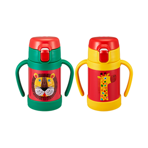 Tiger’s stainless steel child's sippy cup features a straw and is spill-proof. The two handles make it very easy for babies to hold. There is an anti-slip silicon ring at the bottom.